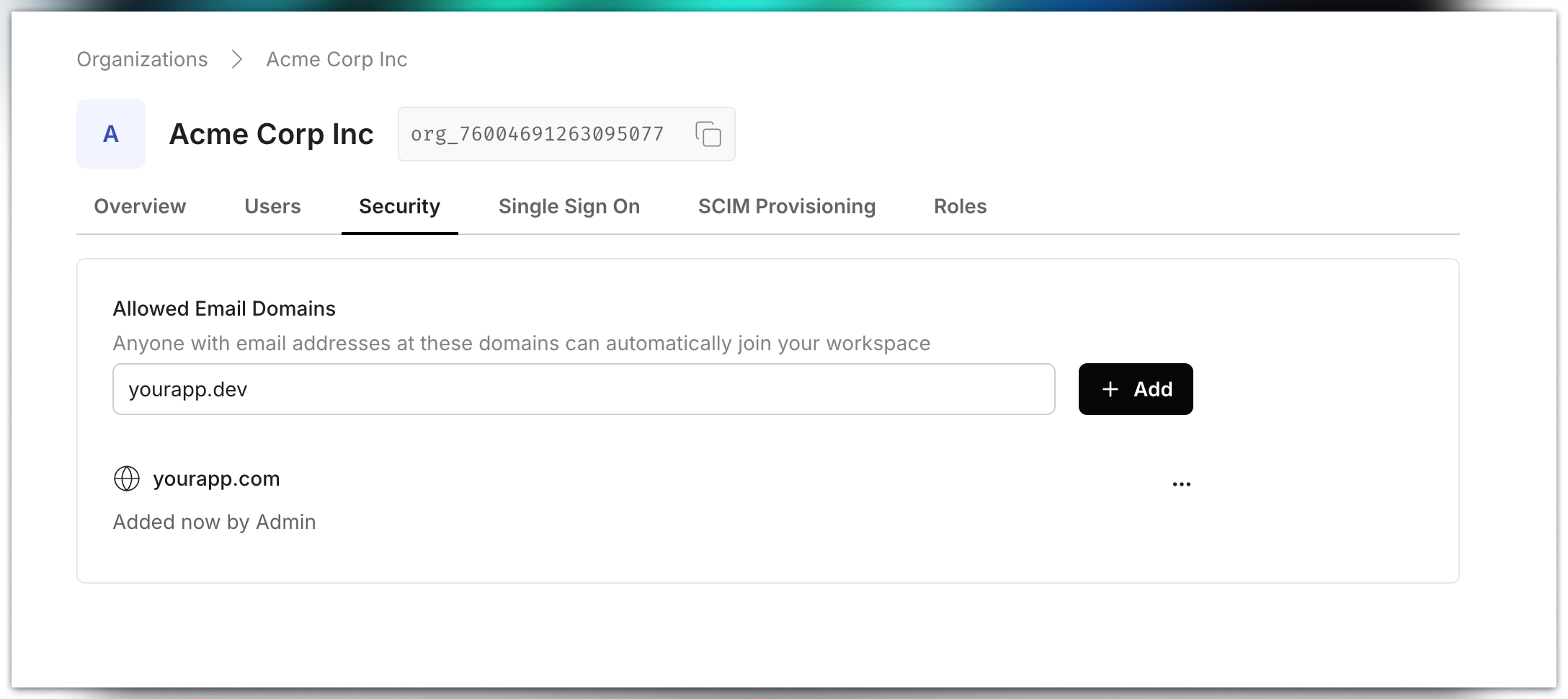 Section titled “Introduction”Allowed email domains can reduce the burden of manual invitation for organization admins, avoid duplicate organization creation, and streamline membership for end users by suggesting the right organization at sign-in/sign-up.
