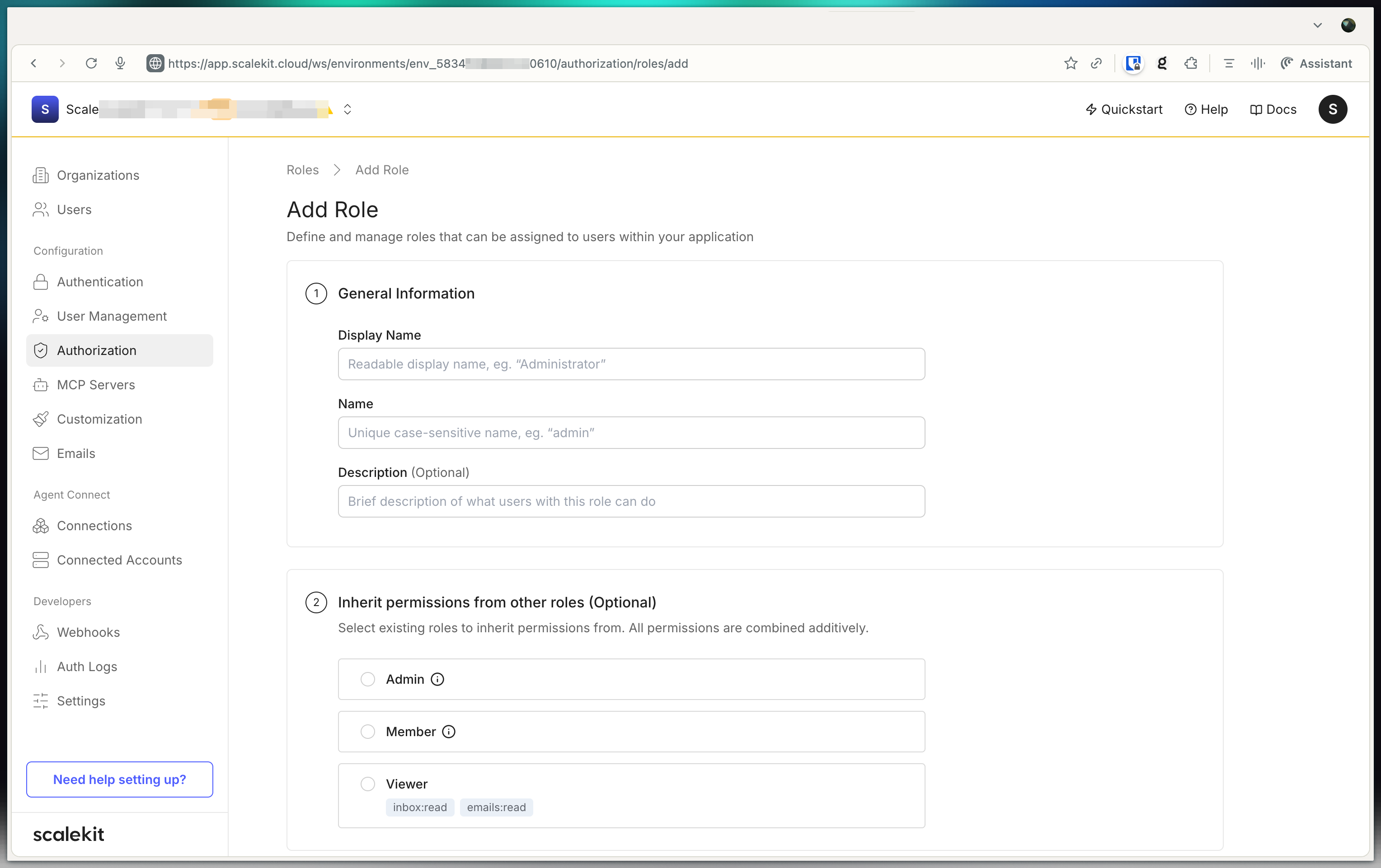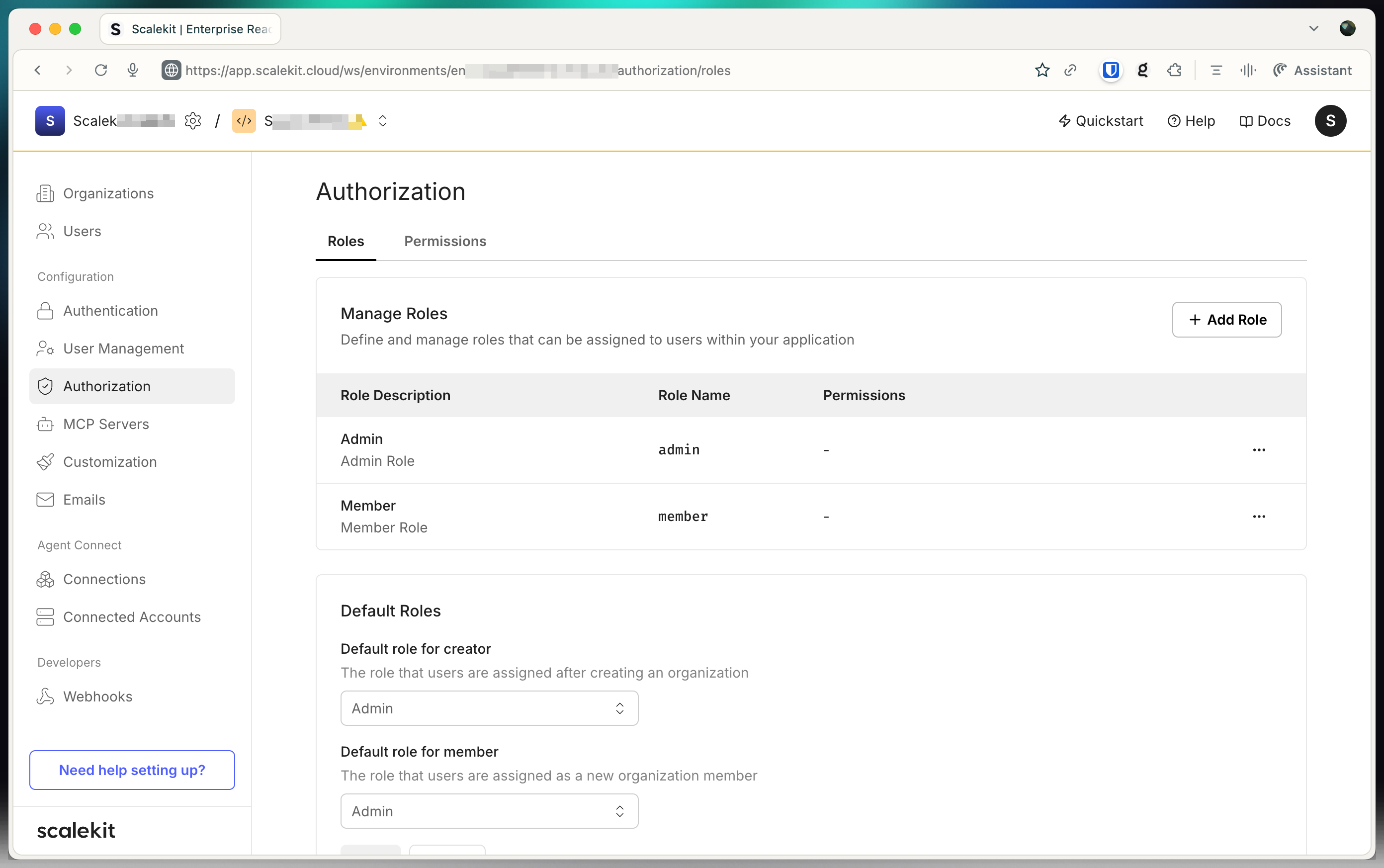 Section titled “Default roles”Scalekit automatically assigns default roles when setting up your organization: