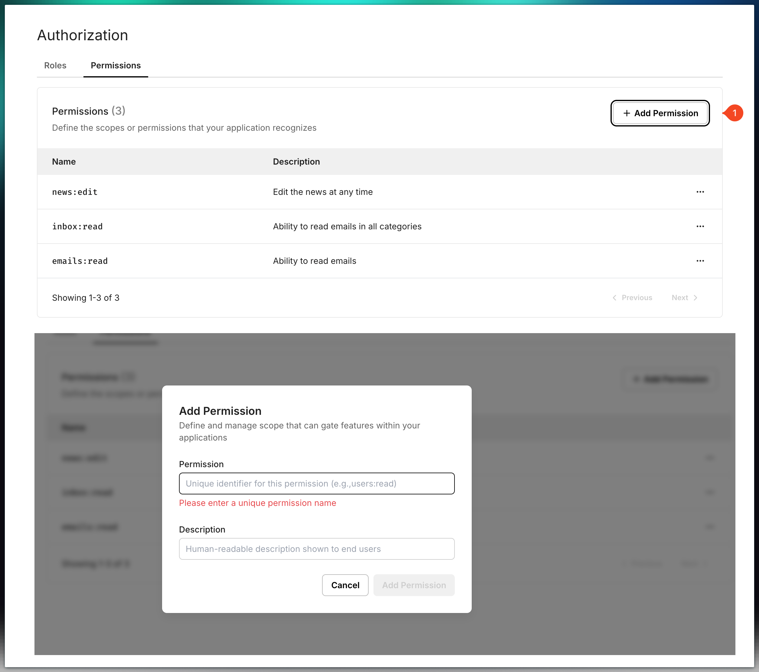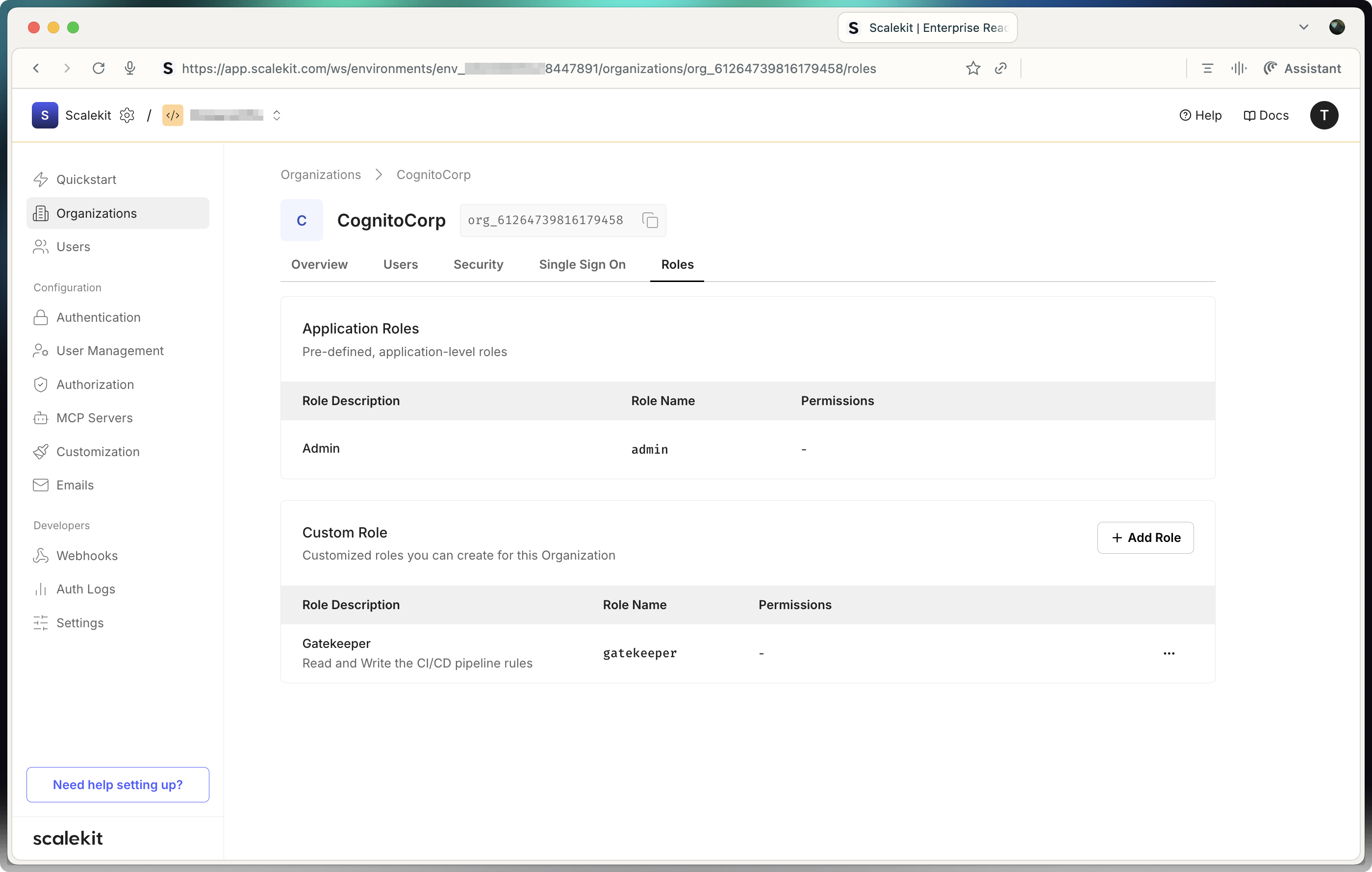 Section titled “Configure organization specific roles”Organization specific roles allow your organization administrators to create roles that go beyond the roles your application can assign.