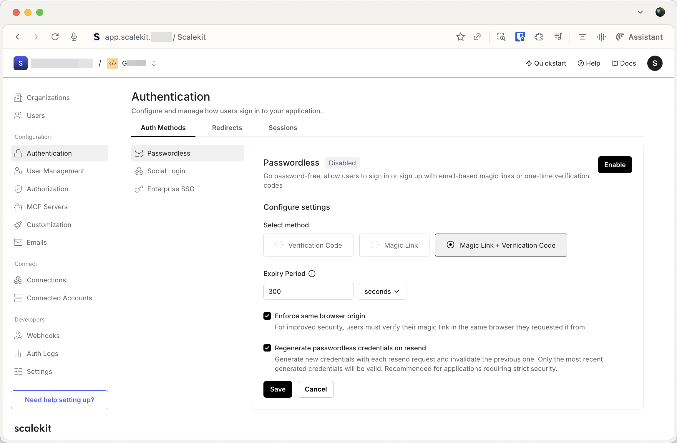 Section titled “Configure magic link & OTP settings”You can modify the magic link & OTP behavior from the Scalekit dashboard without changing your code.