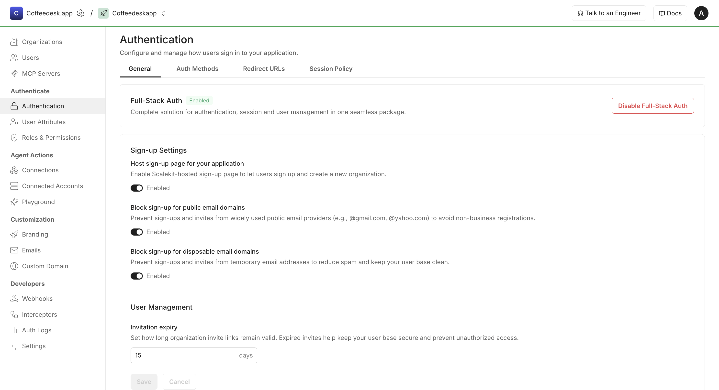 Section titled “Invitation expiry”Configure how long user invitation links remain valid. The default setting of 15 days ensures that invitations don’t remain active indefinitely, improving security while giving invitees reasonable time to accept.