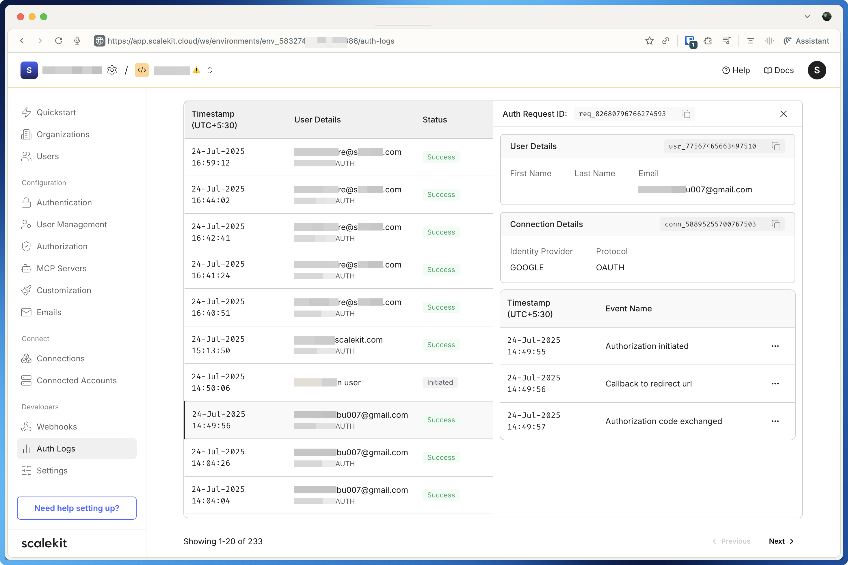 Auth logs provide a complete history of all authentication activities performed by users on your application. Use them to monitor user access, troubleshoot issues, and maintain security compliance.