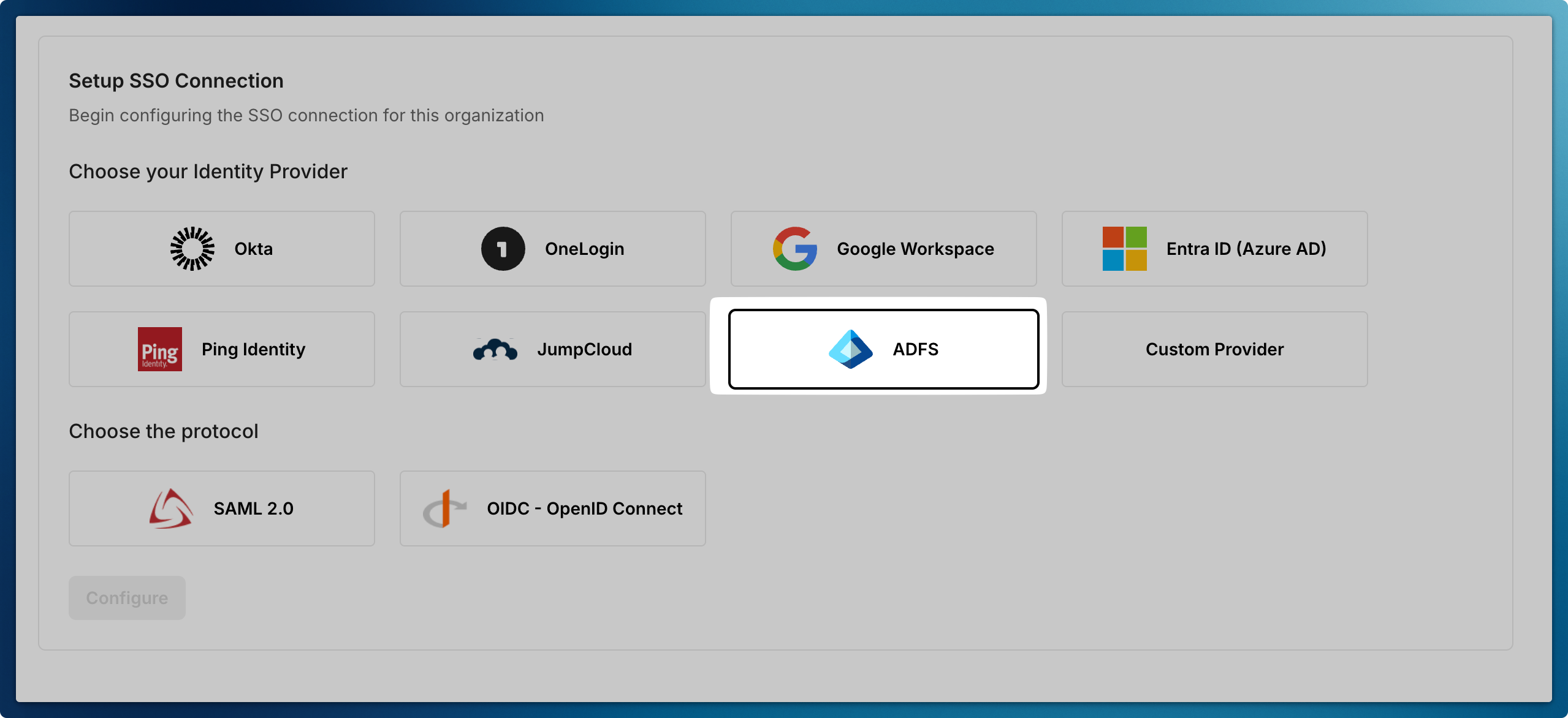 Section titled “Begin the configuration”Choose Microsoft AD FS as your identity provider