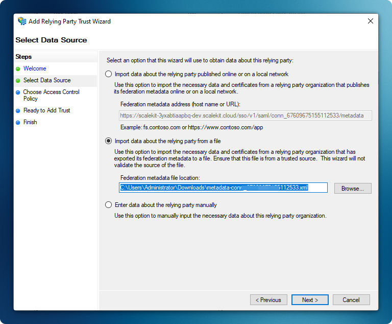 Import the Metadata XML file that you downloaded earlier