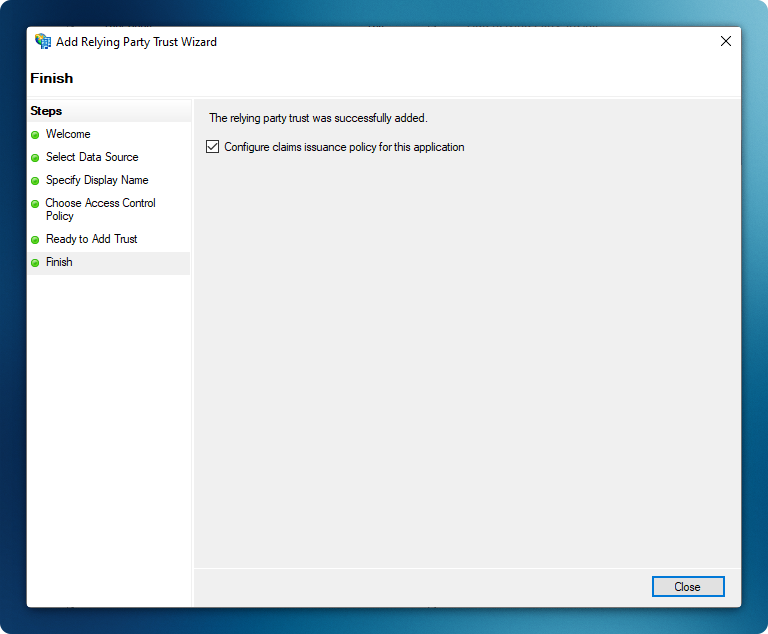The wizard will complete with the ‘Edit Claim Issuance Policy’ option automatically selected