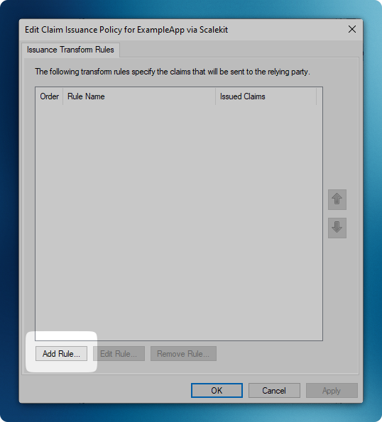 Section titled “Create Claim Rules”- Click ‘Add Rule’ to create a new claim rule