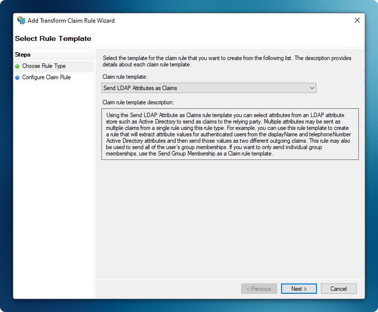 - Select ‘Send LDAP Attributes as Claims’ template