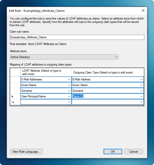 Section titled “Map User Attributes”- Enter a descriptive rule name (e.g., “Example App”)
