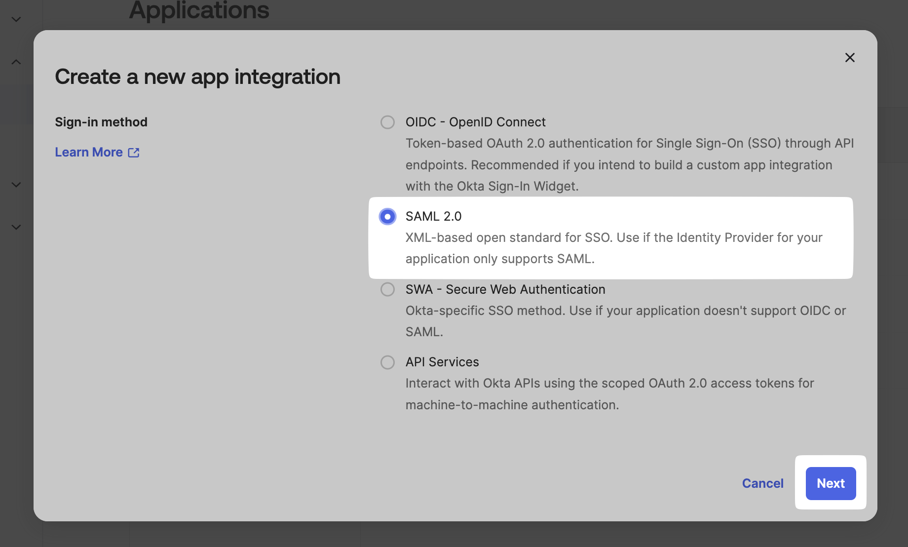 Choose SAML 2.0, and click on Next.