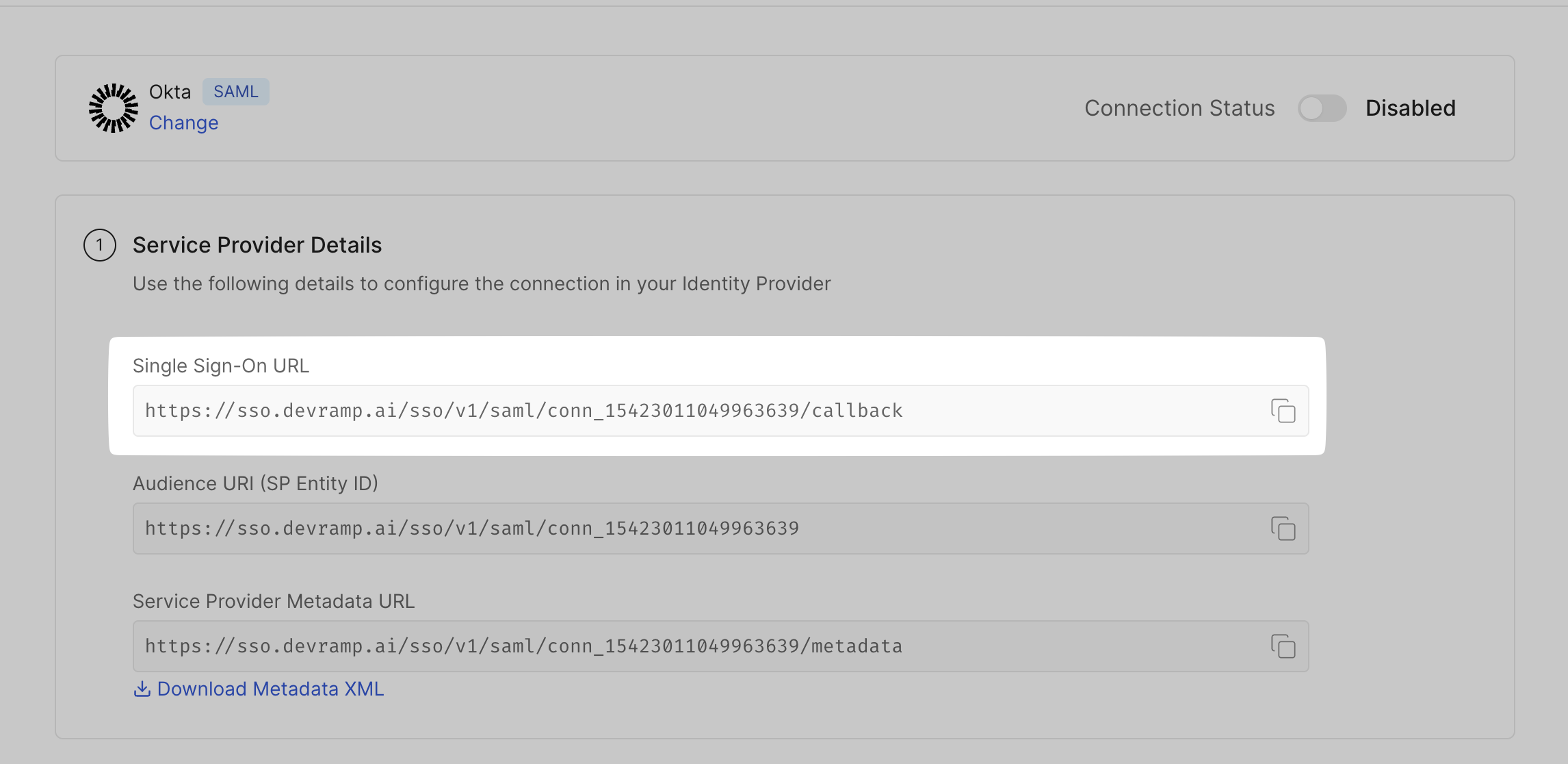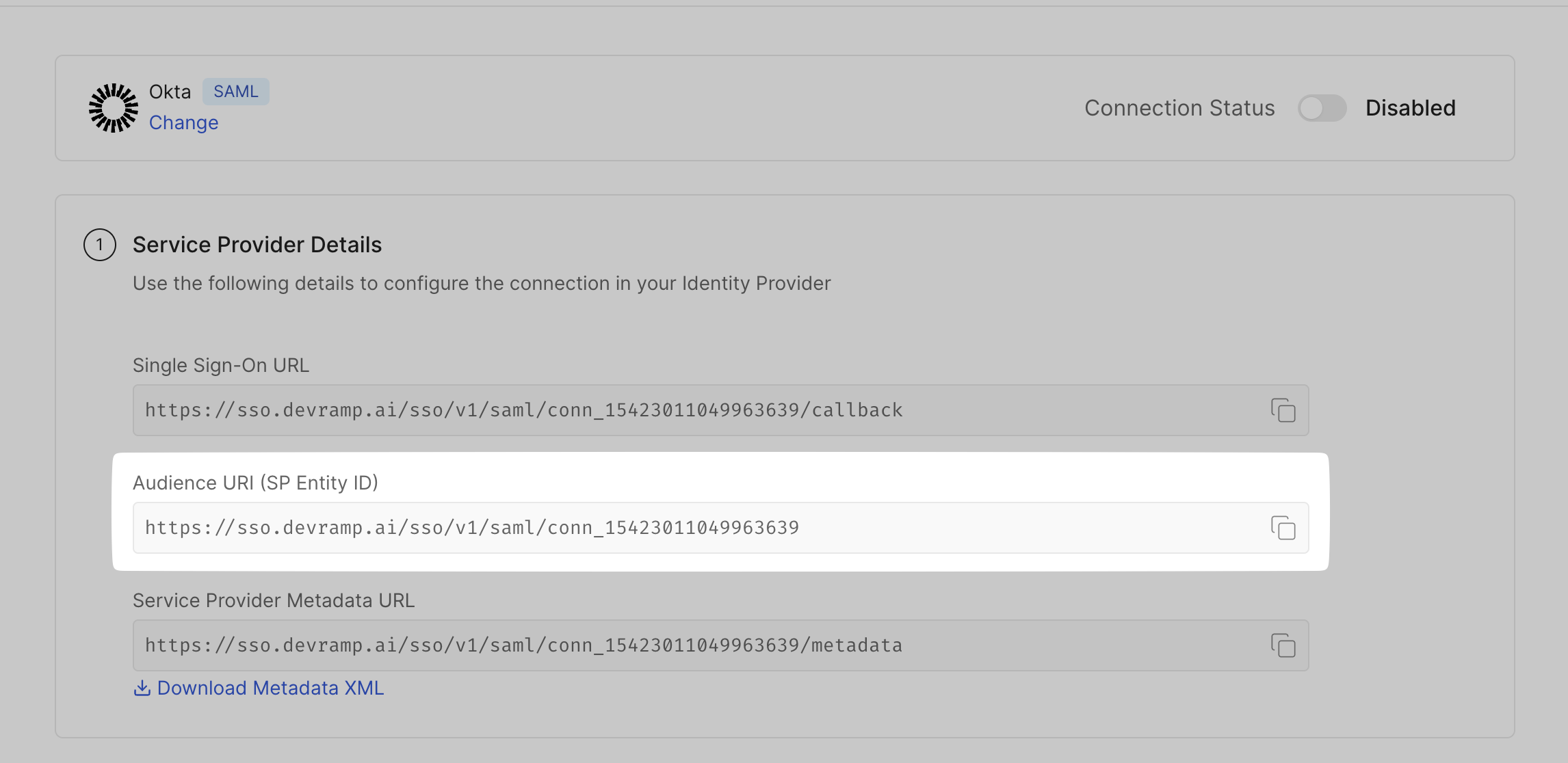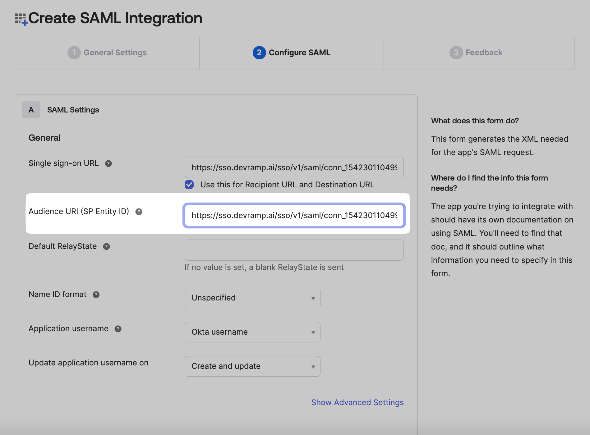 Copy the Audience URI (SP Entity ID) from the SSO Configuration Portal, and paste it in your Okta Admin Console in the space for Audience URI.