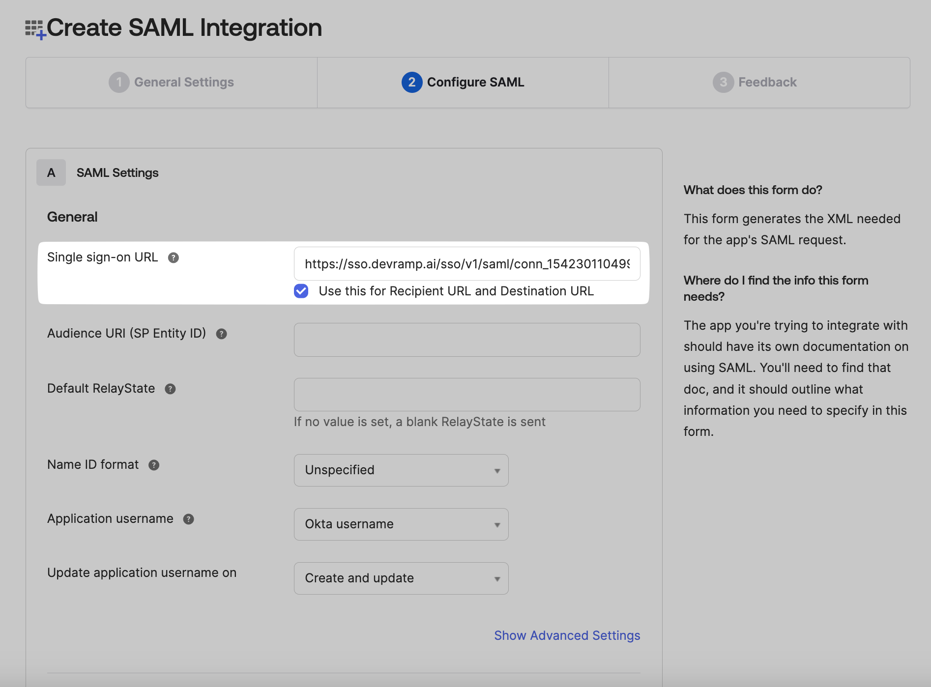 Copy the SSO URL from the SSO Configuration Portal. Paste this link in the space for SSO URL on the Okta Admin Console.