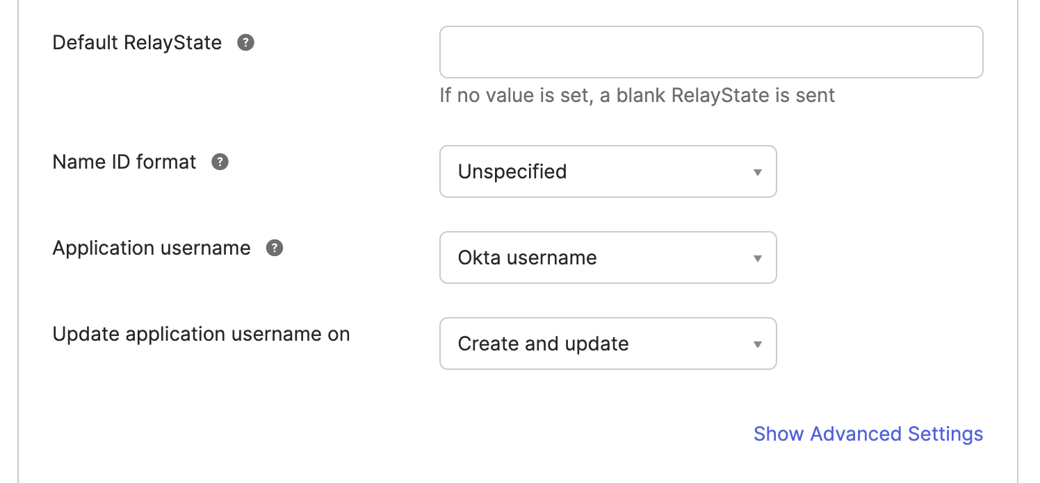 You can leave the Default Relay State as blank. Similarly, select your preferences for the Name ID format, Application Username, and Update application username on fields.